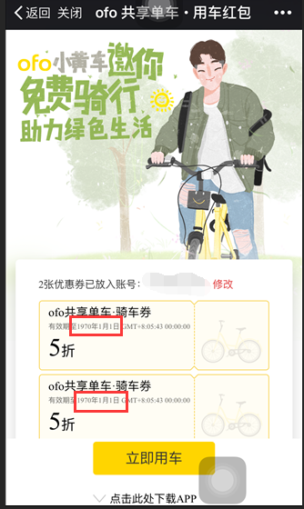 Ofo H5 页 微信支付完成后进入ofo 优惠券页 输入手机号后获取的骑车券有效期显示为 1970年1月1日 Testerhome